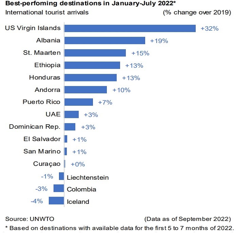 Organizata Botërore e Turizmit e ka renditur Shqipërinë në vend të dytë në botë përsa i përket normës së turistëve ndërkombëtarë. Në “Barometrin e Turizmit Botëror”, publikuar me të dhënat e sektorit të turizmit në nivel global nga janari në korrik të vitit 2022, OBT konfirmon Shqipërinë me një rritje 19% krahasuar me vitin 2019, duke arritur një ndër performancat më të mira të rikuperimit të sektorit pas pandemisë.