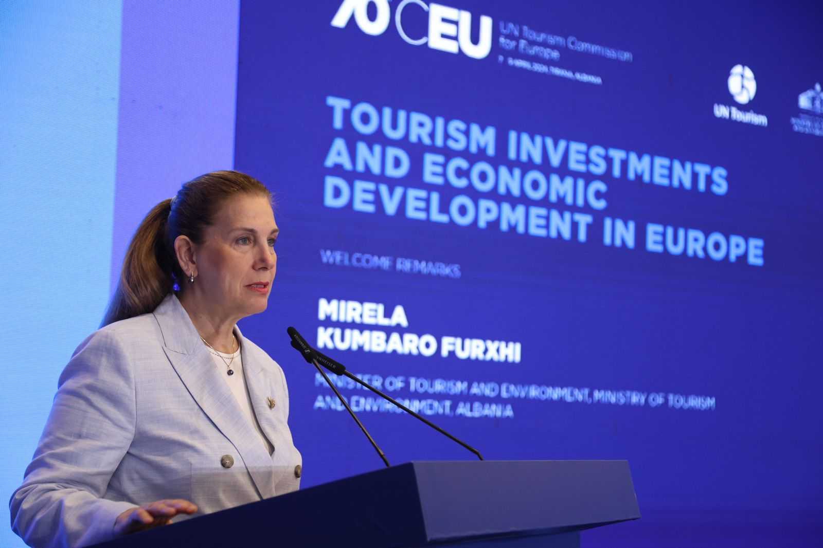 Ministrja e Turizmit dhe Mjedisit Mirela Kumbaro përshëndeti nisjen e kësaj konference dhe u shpreh se Shqipëria ka hyrë në erën e investimeve në turizëm me qasjen e panegociueshme të zhvillimit të qëndrueshëm.