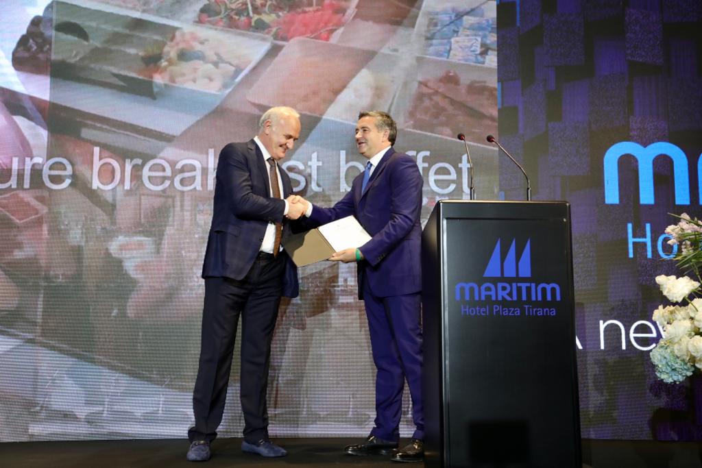 Në fund të fjalës së tij, ministri Klosi, në emër të kryeministrit, i dorëzoi çertifikatën e e hoteleve me 5 yje, Maritim Plaza Hotel. Brendi i njohur është krijuar në vitin 1969, dhe ka një impakt të jashtëzakonshëm në zhvillimin e kapaciteteve akomoduese në Gjermani. Ai pason të tjerë brende që tashmë janë në Shqipëri si: Hilton, Hyat, Merriot, MK Group e Melia dhe shumë investime të tjera të përbashkëta me investitorë shqiptarë.