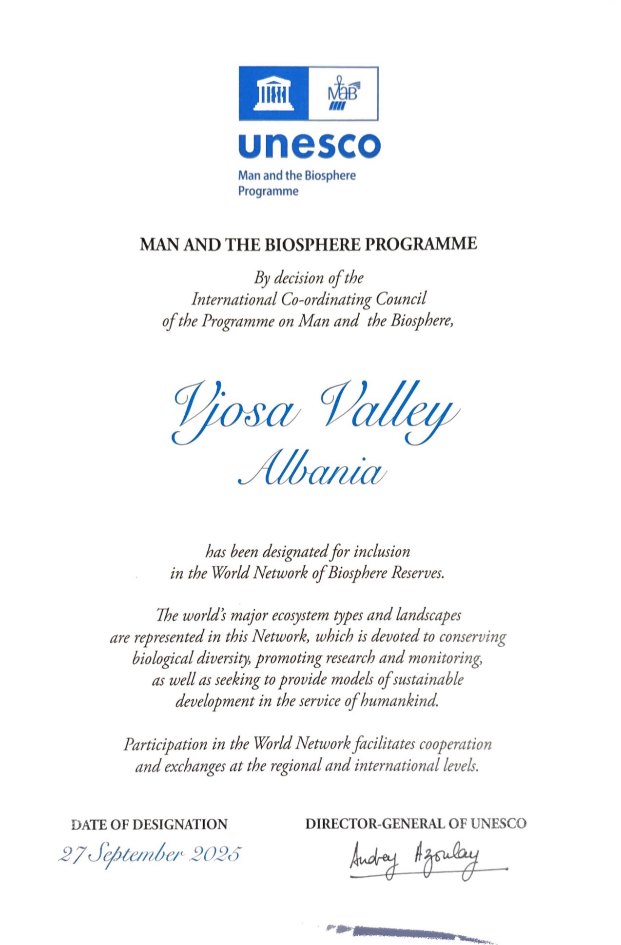Gjatë Sesionit të 37-të të Këshillit Ndërkombëtar Koordinues të Programit “Njeriu dhe Biosfera” (MAB-ICC), mbajtur në Hangzhou, Kinë, UNESCO i dha Vjosës çertifikatën e shumëpritur si Rezervë e Biosferës, duke u bërë kështu pjesë e rrjetit global me mbi 700 Rezerva të Biosferës në botë, që ndajnë përvoja dhe zgjidhje për ruajtjen e natyrës dhe zhvillimin e gjelbër.